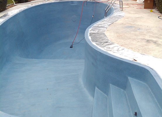 Hot-flocking Is Completed The pool surface is coated with a two-part epoxy and allowed to start to cure. When the epoxy is in the tacky stage, the Aqua Brightâ„¢ powder is applied.